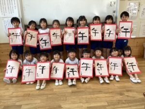 ポプラ組さんとお書初めをしました。 今年の干支の「午」という字。初めて持つ筆で個性あ
